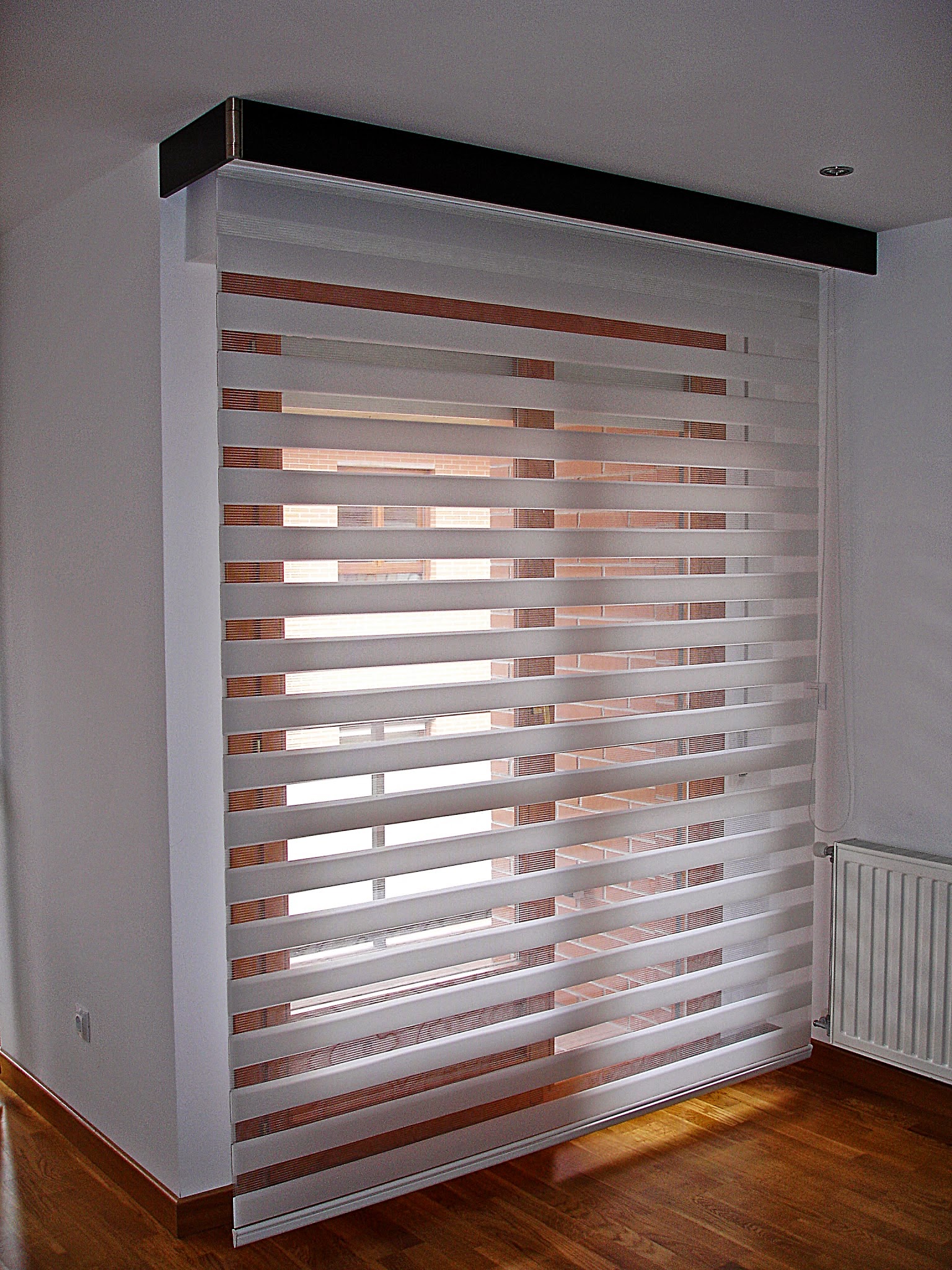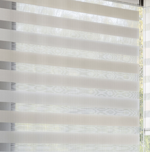 Estor enrollable de doble tejido formado por bandas alternas transparentes y traslúcidos, que permite dejar pasar la luz o bloquearla según como se regule.