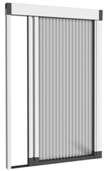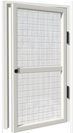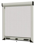 La Plisada sin plisar. Dispone de un perfil fijo de aluminio en el cual se aloja un eje con la malla enrollada. Novedoso sistema para instalación en puertas de paso frecuente, con un carril inferior de reducidas dimensiones.