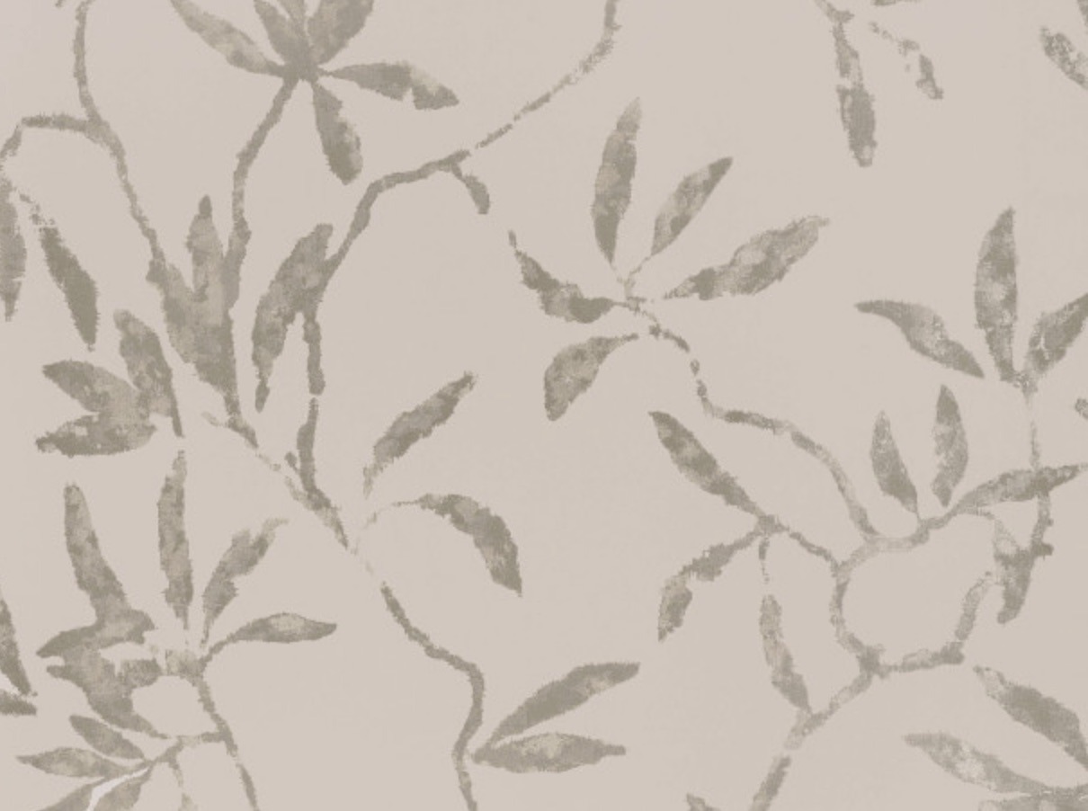Un estampado metálico envejecido da una apariencia finamente tejida a este diseño sencillo de follaje inspirado en los perales elegantes de la casa señorial Chatsworth House.